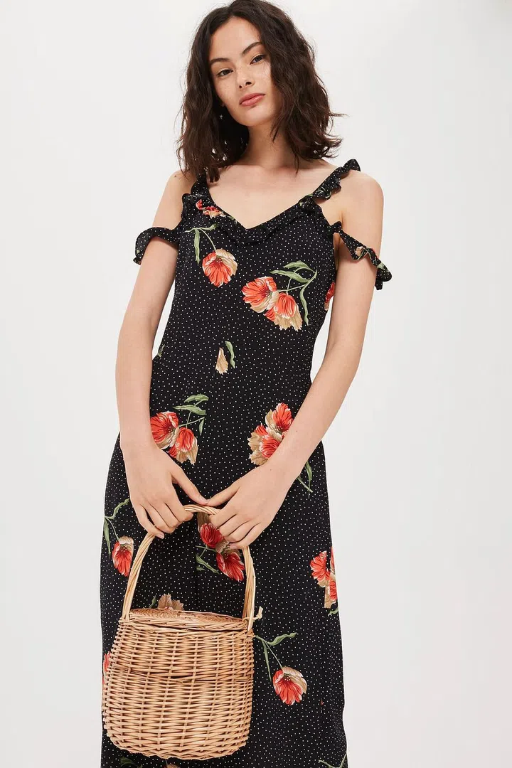 Here’s a style tip: if you want to pair your basket bag with a bold or printed dress – such as the one we see here – the trick is to contrast it with one that’s clean and simple looking.
