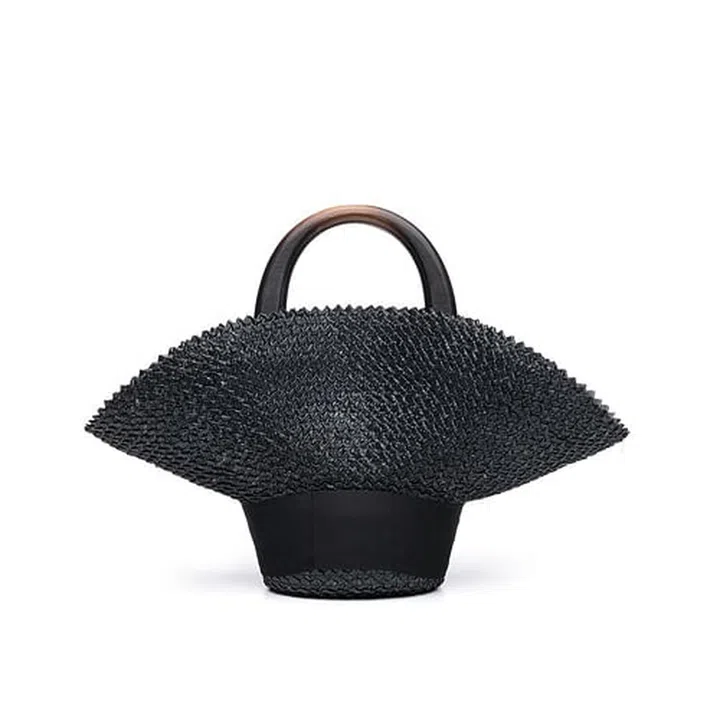 The perennial straw-woven bag trend just won’t quit, and we personally can’t get enough of it. Taking the design of an atypical wicker bag up a notch with an unexpected silhouette, this number features a unique “upside-down hat” design with wooden handles. We love the choice of the colour too; there are plenty or raw beige-hued straw bags out there, but it’s rare to see one in black.