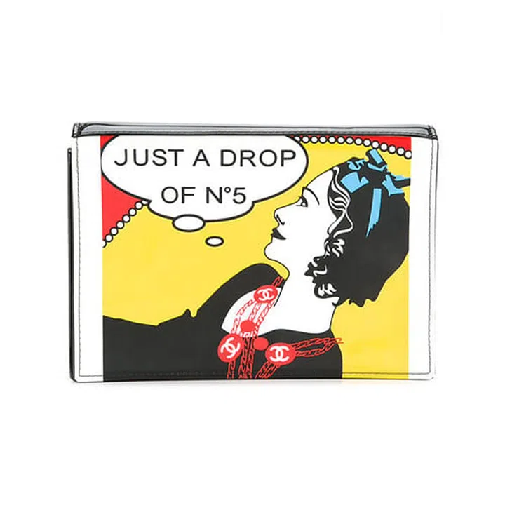 Designed from glossy patent leather with a tongue-in-cheek vintage print on the flap, this vibrant clutch is exactly what the eclectic doctor ordered. This clutch acts as a conversation starter, offering a wink at Chanel’s iconic No.5 perfume with the slogan “Just a drop of No.5” printed in a comic book-style illustration.