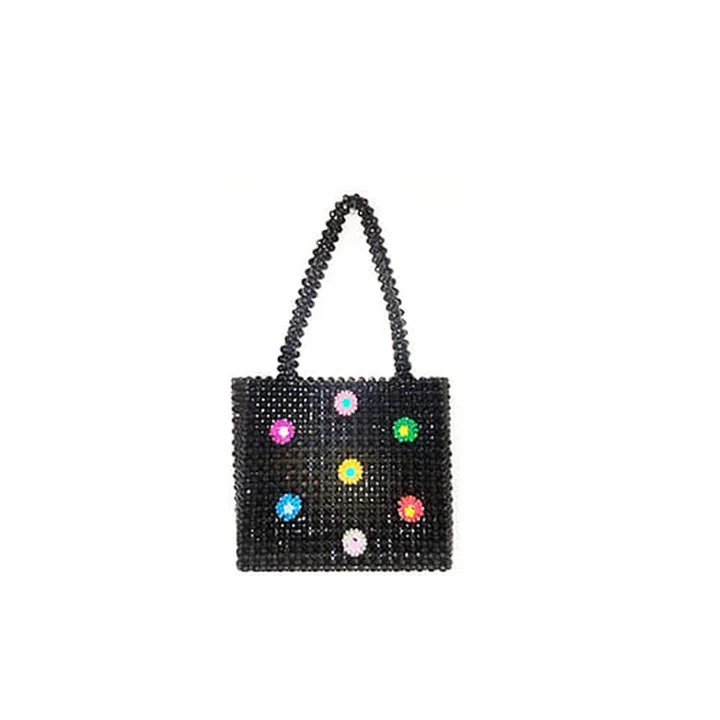 This hand-beaded bag is packed with a whimsical vibe that brings us back to our childhood days. Featuring colourful beaded flowers that bring to mind perler beads, this crafty receptacle has a grown-up twist and charm to it.