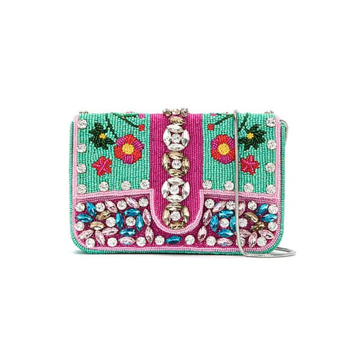Encrusted with statement gemstones and embroidered with colourful beads, this folk-themed shoulder bag is an eye-catching statement piece that will define any outfit. Topped with floral patterns, this charmer will liven up your ensemble whether you’re headed to a party or to the beach.