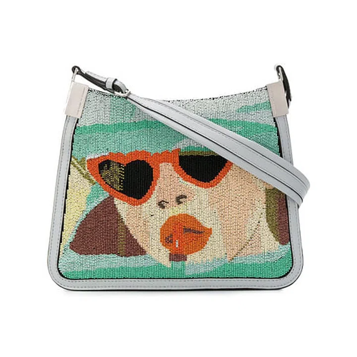 Embroidered with colourful micro beads to make up a vintage-style image of a lady applying red lipstick (check those on-trend heart frame sunnies too!), this shoulder city bag is fun, zesty and sophisticated.