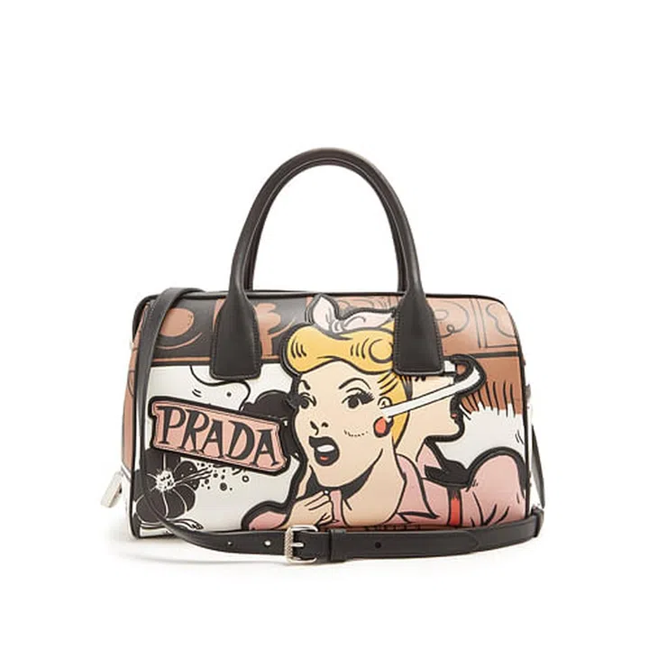 Prada’s spring summer 2018 collection featured comic book-style graphics from female artists, including the multicoloured combined prints on this black bag created by Trina Robbins and Brigid Elva. Boasting of the house’s classic bowling bag shape with a detachable shoulder strap and powder-blue hot-stamped logo appliqué, this retro-esque style will add a whimsical flourish to your look.