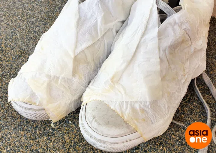 Next, place toilet or tissue paper all over the wet shoes and you're done. All that's left is to leave them out to dry.