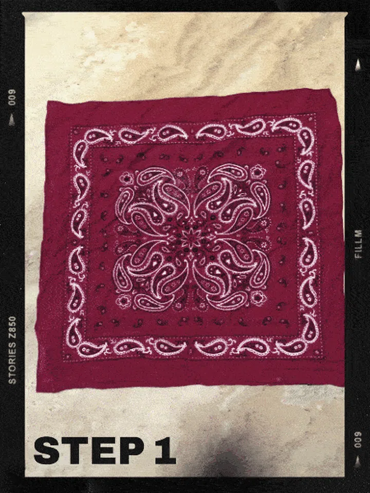 What you’ll need: A square scarf/bandana (if you don’t have either, just cut up any clothing item you have into a 30cm x 30cm square) and two hair ties.