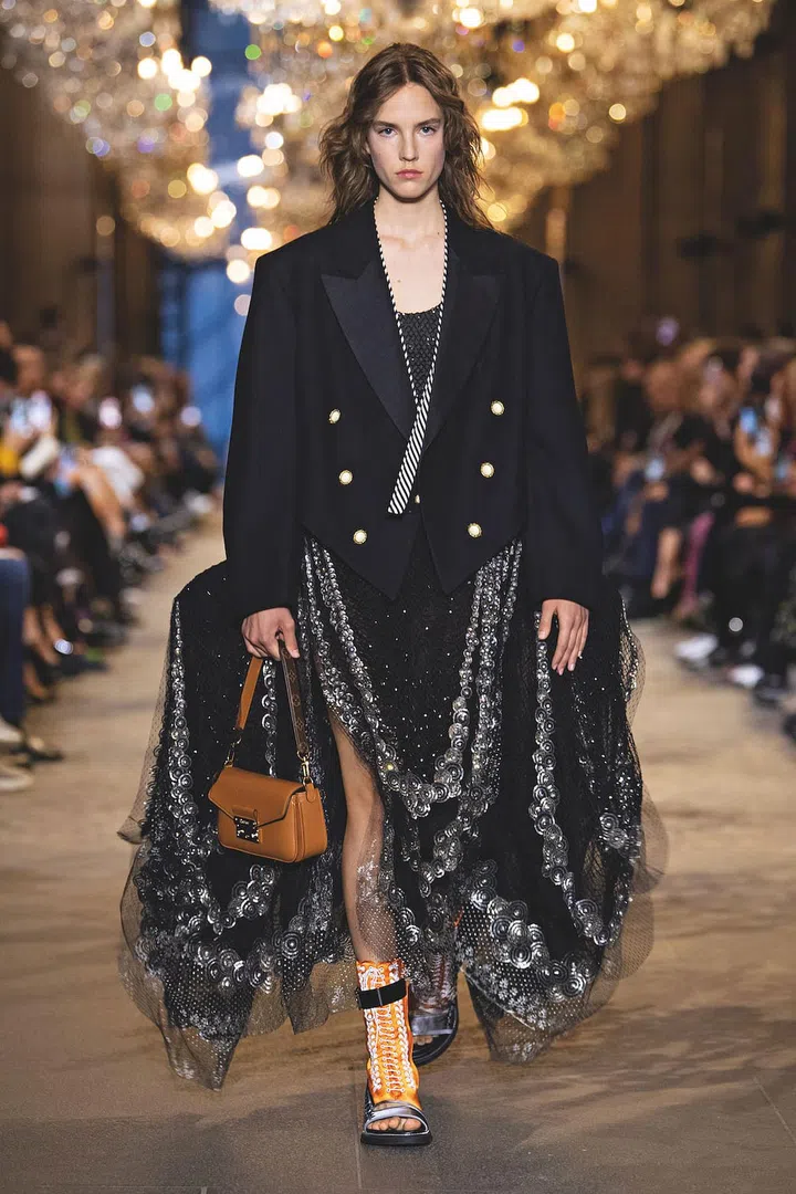 Artistic director Nicolas Ghesquiere is a master at mixing up references and juxtaposing unexpected elements to create something fresh and exciting every season. For this collection, he referenced 19th century hoop-inspired skirts, paired with masculine jackets and open-toe wrestling boots in satin.
