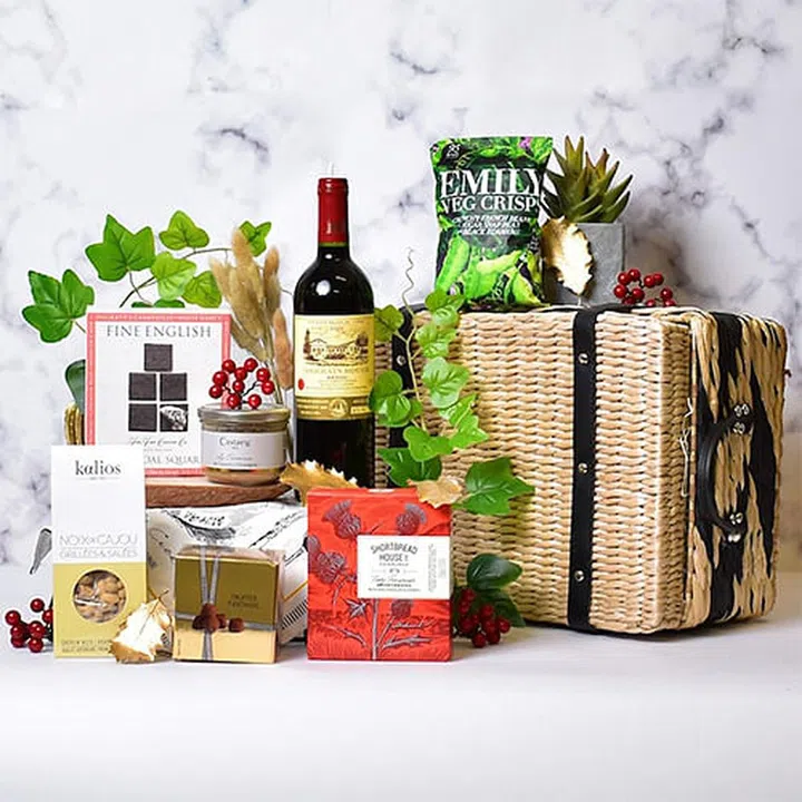 We love the Secret Admirer hamper that houses treats — such as truffles chocolates from Mathez, handmade shortbread from Shortbread House of Edinburgh, Fine English Charcoal Squares from the The Fine Cheese Co. and a bottle of De Luxe Croix Du Marquis Merlot — in a cute basket case.
