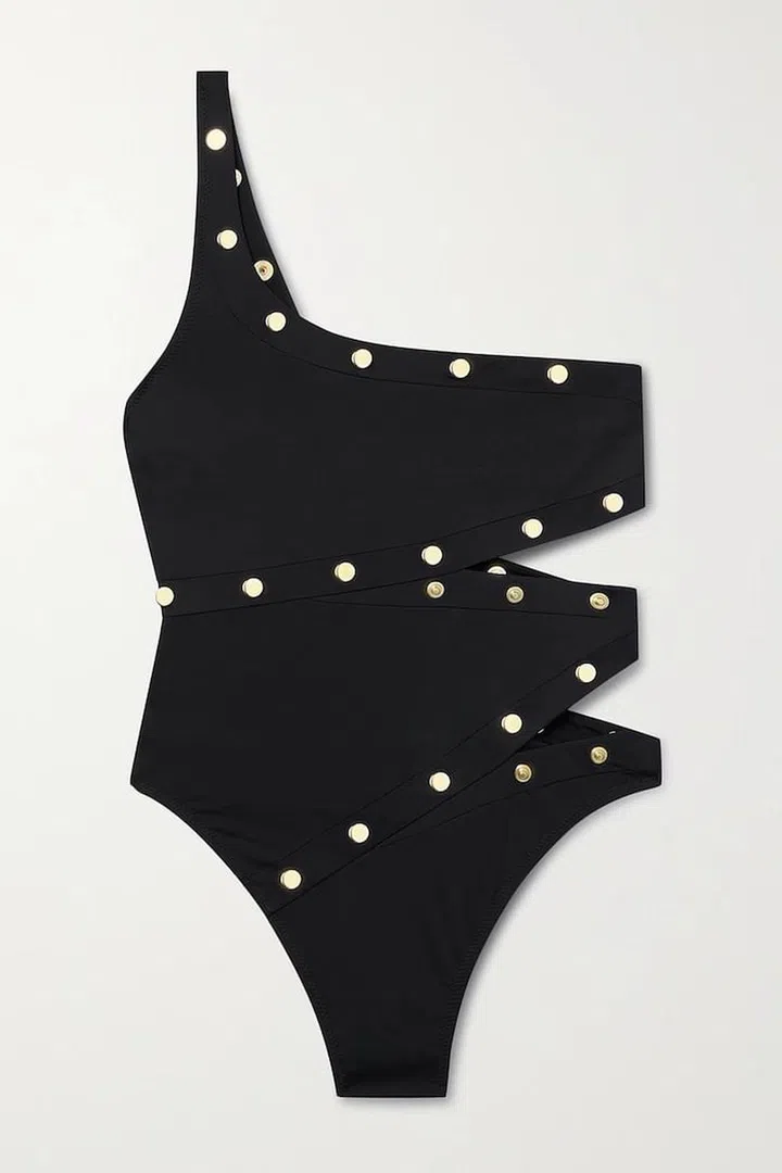 + NET SUSTAIN One-Shoulder Embellished Cutout Stretch-ECONYL Swimsuit, $248, Stella McCartney at Net-a-Porter