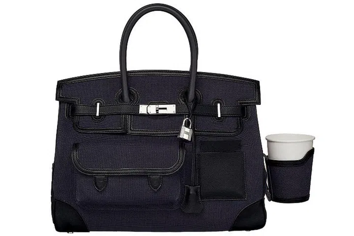This is what happens when the iconic Birkin bag goes into a utilitarian mode. Taking inspiration from military fatigues, this canvas Birkin is adorned with five cargo pockets on the outside (adding more room to the already roomy bag) while the side of the bag features a removable holder for your paper cups. Which begs the question: Is it finally appropriate to take your Birkin camping?