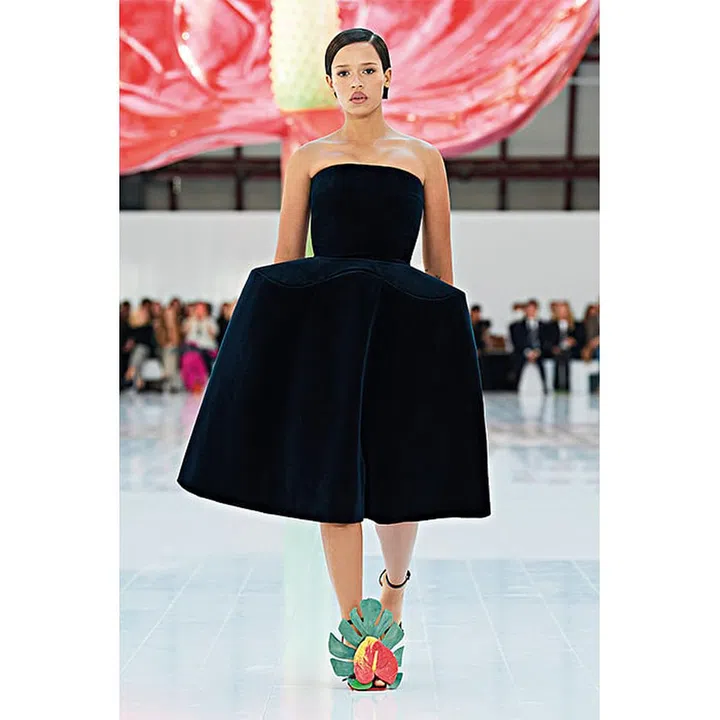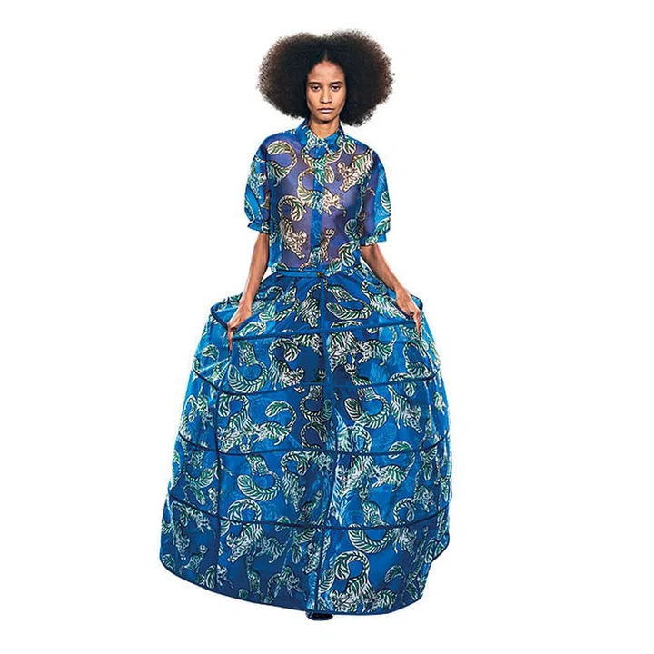 And if whimsy is your word for 2023, Rocha’s version of a printed shirt dress – decorated with big cats with heart-shaped faces and complete with a pannier-inspired skirt – may just tickle your fancy.