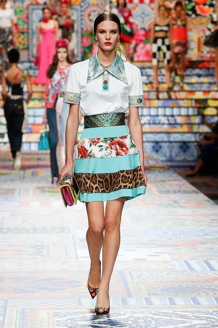 At Dolce & Gabanna the casual polo shirt gets a tailored treatment with a boxy cut and exaggerated jacquard lapels.