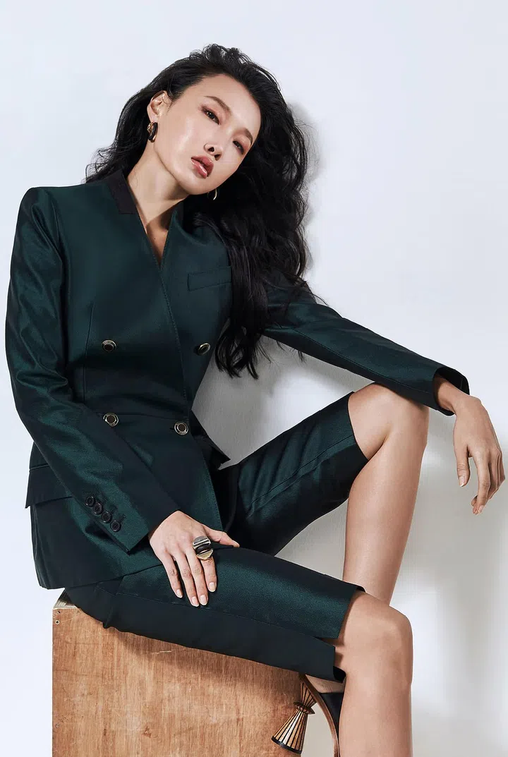 A double-breasted jacket with signature ’80s gold buttons might smack of a Dynasty throwback, but wearing it with shorts transforms it into a high impact and contemporary look.