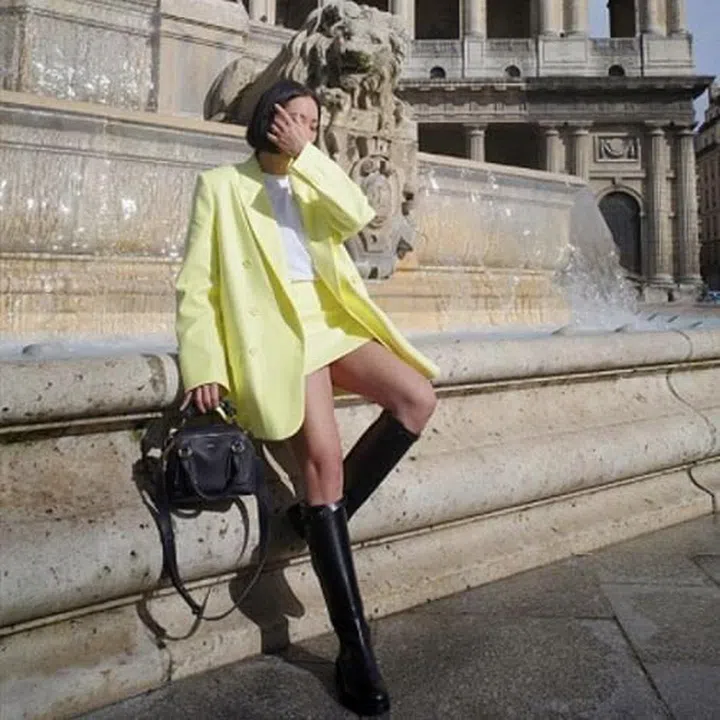 As seen on Tiffany Hsu, the buying director at Mytheresa, a bright fluorescent yellow skirt suit can look incredibly polished and chic. The key here is to opt for a well-tailored suit jacket in an oversized, slouchy silhouette to create a cool and relaxed fit that extends slightly past the hemline of your mini skirt. Bright saturated colours such as lime green and coral orange are also in this spring, so don’t be afraid to experiment with louder, in-your-face hues when it comes to your coordinated two-piece.