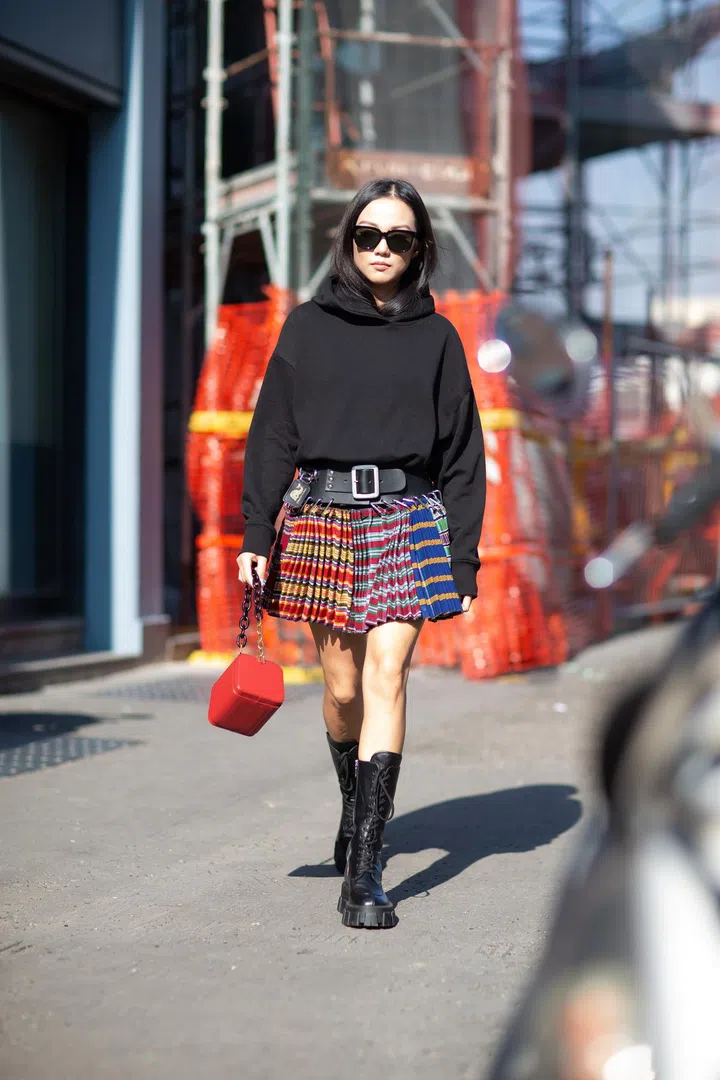 Teaming an oversized black hoodie with a tartan printed mini skirt with pleats and a wide-cut belt, Yoyo Cao pulls off an urban take on punk dressing replete with oversized sunnies and lace-up mid-calf combat boots. For a similar casual cool vibe, style a mini skirt in denim or colourful prints with a graphic sweatshirt or oversized hoodie and finish the look with block heeled ankle boots.