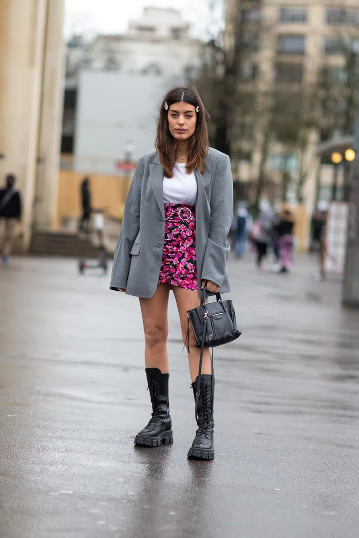 Spanish fashion influencer Aida Domenech shows us how to look great in a graphic floral printed mini skirt. Teaming a high-waisted ruched skirt with bright pink florals with a casual white tee and an oversized grey blazer, Aida finishes her look with tall combat boots for a modern look that balances between ladylike and edgy for a grown-up vibe.