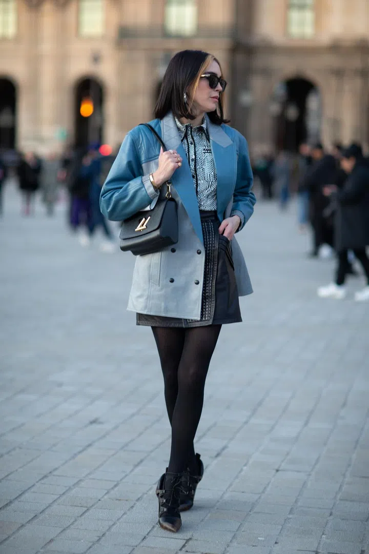 Style influencer Brittany Xavier dresses a prim printed buttoned up blouse with an A-line leather mini skirt and a color blocking turquoise and grey leather jacket with oversized proportions and contrasting textures in the form of quilted leather panels for added interest. Pairing a mini skirt with higher necklines, such as a polo top, a high buttoned up collar, and a mock neck can complement and ground a mini skirt if you’re afraid of baring too much skin.