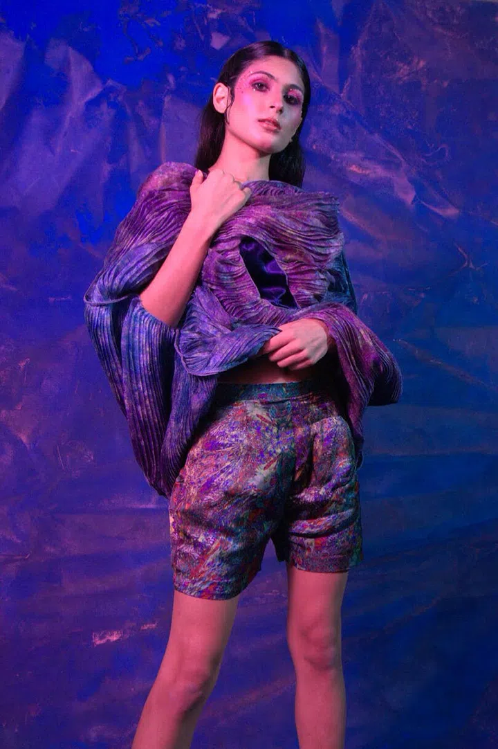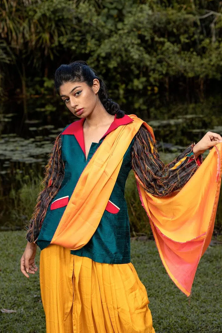 The rich colours and experimental style on Tanvi's designs represent how a sacred tree in India looks normal on the outside but it is in fact vibrant and colourful on the inside. "Kalpa-Pat is a collection inspired by the diversity of Indian culture, particularly the myth of Kalpavriksha," said Tanvi.