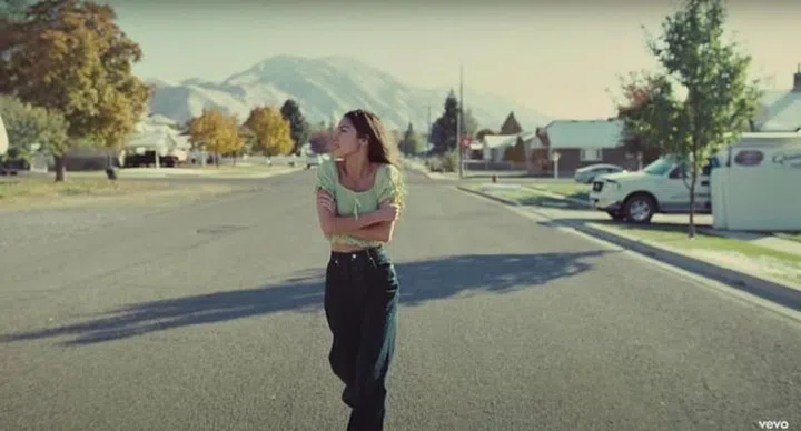 This denim dungaree she’s wearing in the music video of “Driver’s License” is another outfit that many people love because of the nostalgic ’90s vibe.