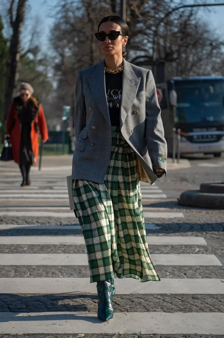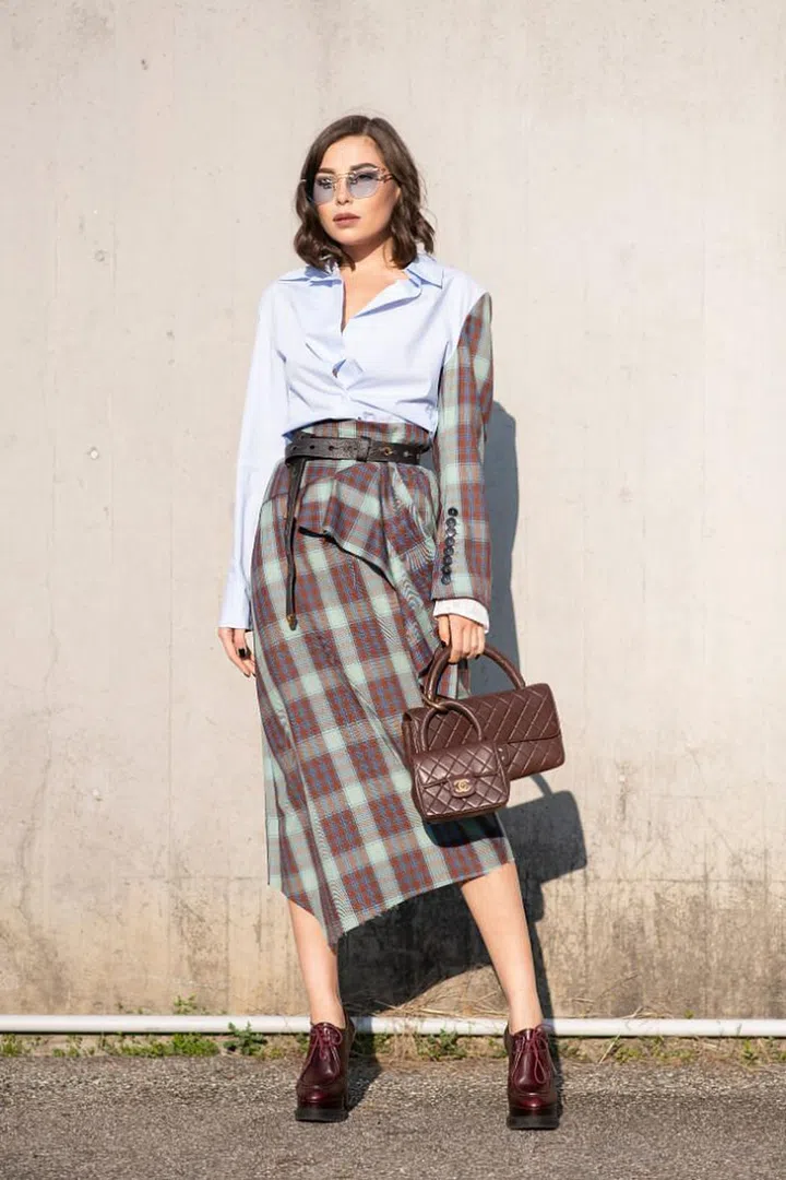 Your typical shirt skirt pairing with a twist. Find an anchor—in this case a tartan print—to tie the look together.