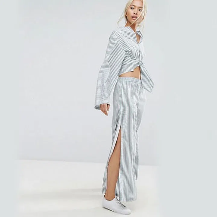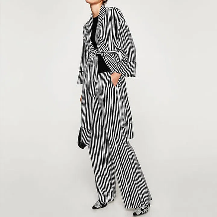 Supersize your basics with this clean, austere striped bloused and matching oversized flare trousers. It's anything-but-basic appeal makes for a comfortable (yet stylish) choice for both the office and 'zzz land'.