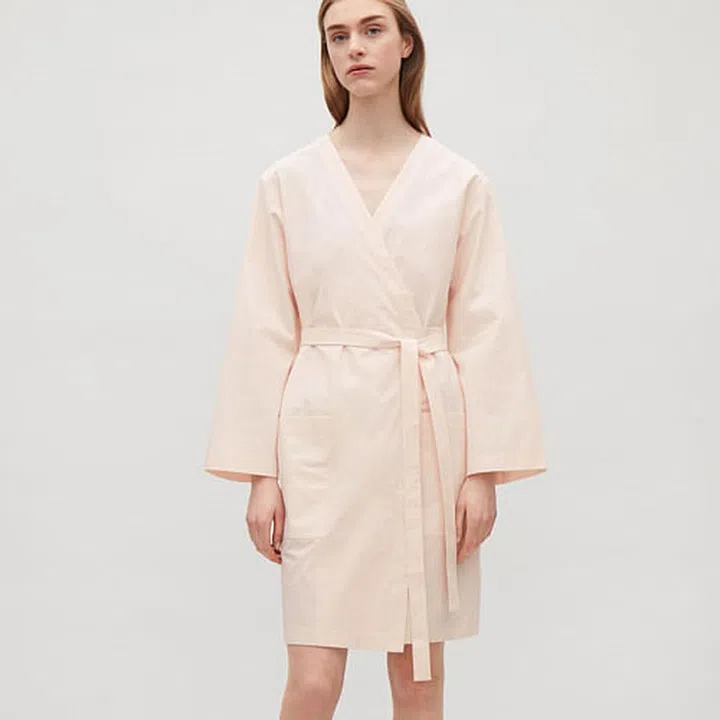 This lovely pastel peach poplin robe has a relaxed fit, slightly dropped shoulders and neat, topstitch finishes for a luxurious look. Think: Bathrobe, but elevated.