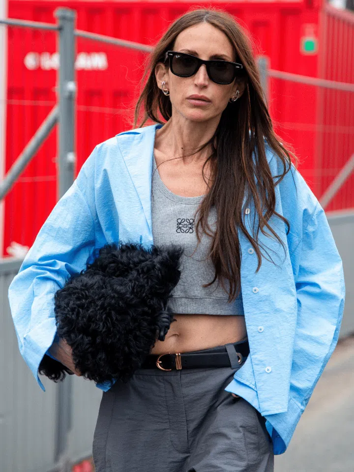 The trick here is to dress it up in a way that makes it look more like a cropped top than a sports bra. Finding a bra with good support and sans sporty logos or overly athletic details is a good place to start. Team with a chic blazer and trousers, and whatever you do, avoid sneakers. You’re now ready to take meetings at the office.