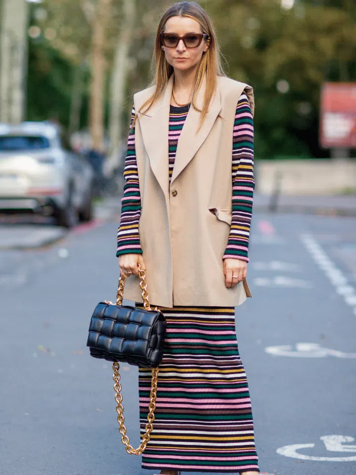 Ah, the ever-reliable house dress. Usually cut like an elongated t-shirt, keep the comfort and ease of movement that your fave WFH dress lets you enjoy by teaming it with more contemporary outerwear. Oversized vests are having a moment now, but you can always count on a boyfriend blazer or a white shirt knotted at the waist to spruce up your look easily.