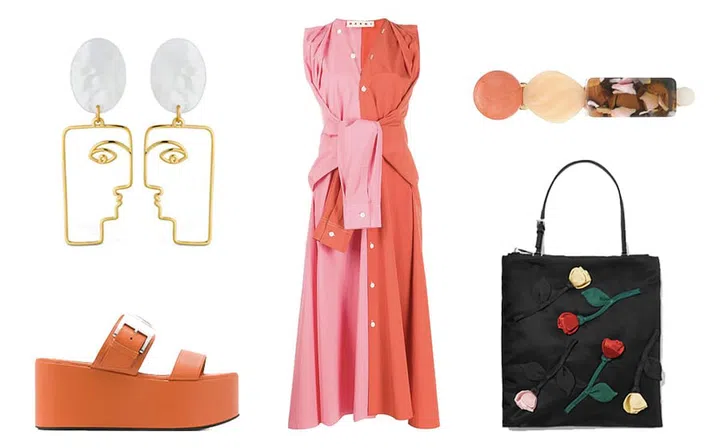 Nina Kastens Mop face earrings w/ mother of pearls, S$504 from Luisaviaroma; Simon Miller buckle strap sandals, US$704 from Farfetch; Marni two-tone tied sleeves dress, US$1,422 from Farfetch; Lele Sadoughi stacked stone barrette, S$185 from Mytheresa; Prada Fiori leather-trimmed appliquéd nylon tote, US$1,441.62 from Net-a-Porter