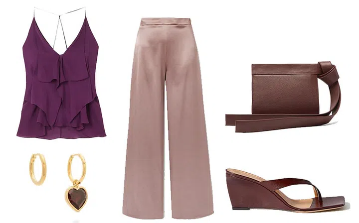 Match a deep purple camisole with cascading ruffles together with a silky pair of wide-leg pants in a pearlescent “antique-rose” hue. Balance out the silhouette of the billowy wide legs with the sleek, sharp lines of these minimalist mules by By Far, and go for a burgundy clutch bag to match.