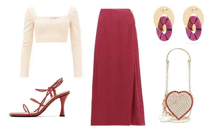 For V-Day 2020, team this top with a relaxed wrap skirt in glittering pink for a pop of colour. Coordinate the look with minimalist square-toe strappy sandals in red, an occasion-fitting heart-shaped bag bedecked in crystals, and contemporary hoop earrings with an artful finish.