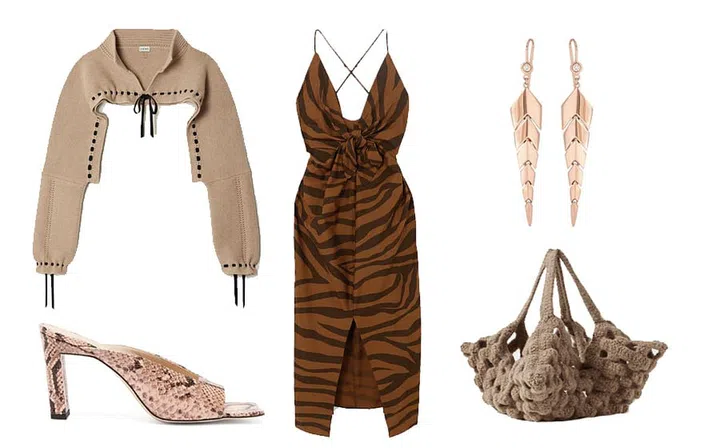 Loewe cropped tie-detailed wool and cashmere-blend sweater, US$1,150 (S$1,569.61) from Net-a-Porter; Wandler Isa square open-toe python-effect leather mules, S$490 from Matchesfashion; Mara Hoffman + NET SUSTAIN Lolita knotted tiger-print organic cotton maxi dress, US$371.01 from Net-a-Porter; Jacquie Aiche fishtail 14kt rose-gold drop earrings, S$2,129 from Mytheresa; Lauren Manoogian New Grid wool tote, US$231.32 from Net-a-Porter
