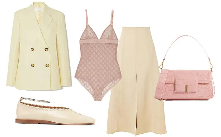 Dip a foot in the “relaxed tailoring” trend and opt for an oversized blazer in a pastel sunshine yellow. Team it with a matching midi skirt in the same colour and give the look a sexy V-Day-twist with a soft pink embroidered tulle bodysuit that resembles lacey lingerie.