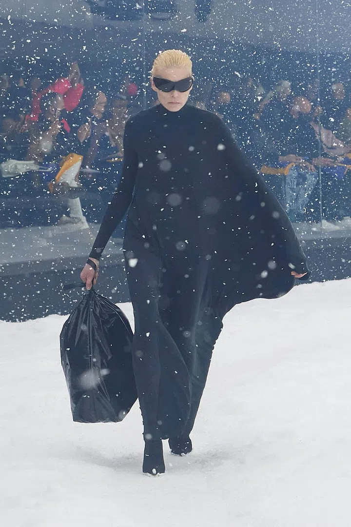 The entire show was set in a rotunda that mimicked a snow globe. A wind machine blew aggressively against the models who were trudging painstakingly through the fake snow. This was creative director Demna ode to the dangers of climate change.