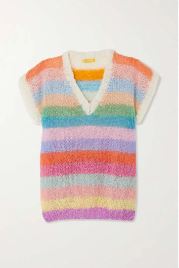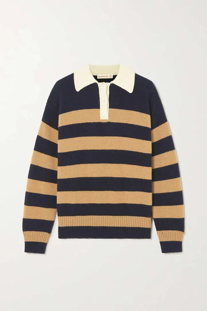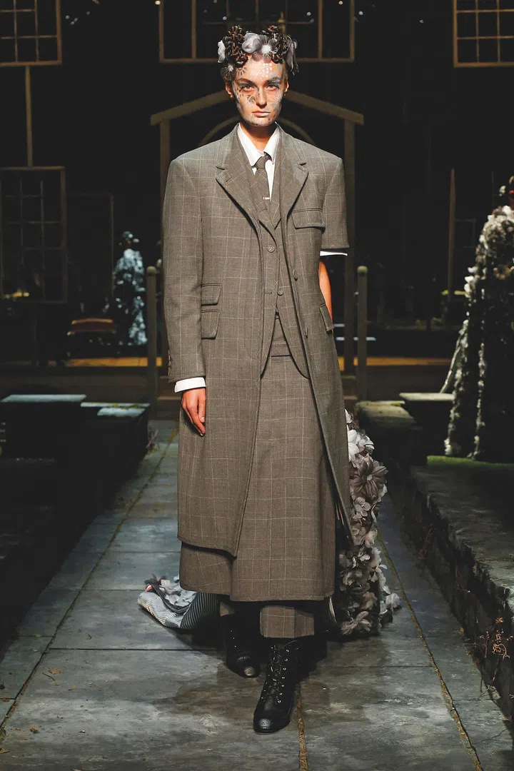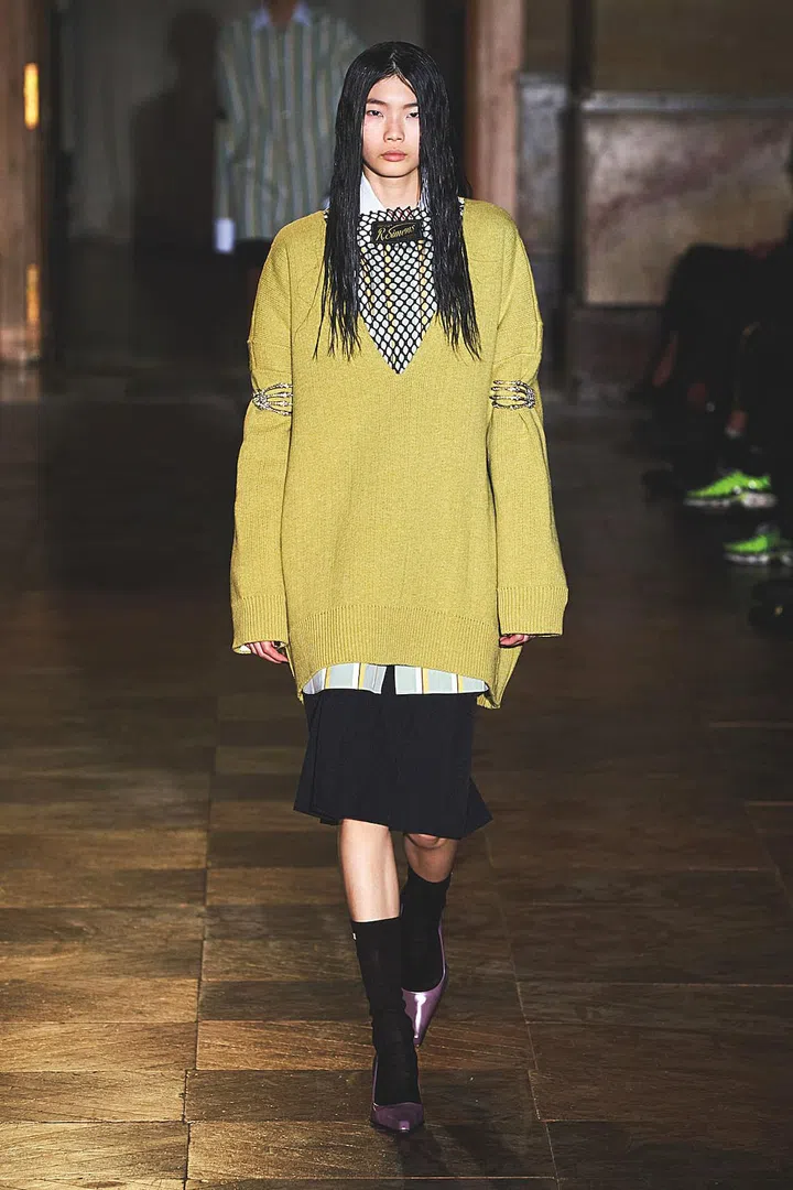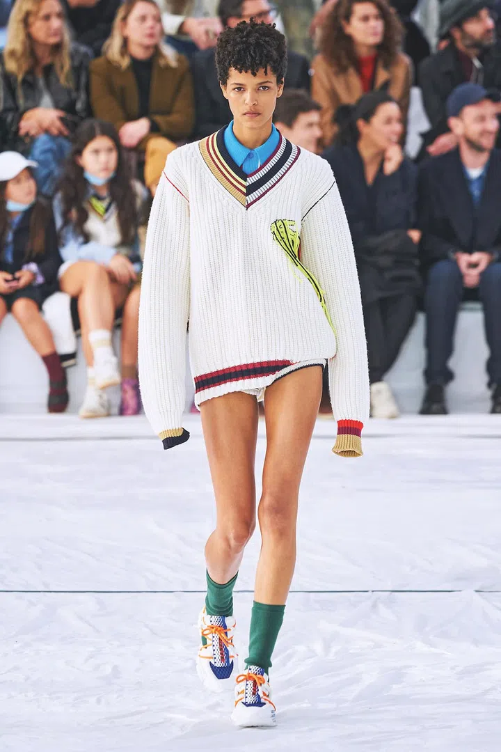 Other “rebellious student” looks include asymmetrical sleeves at Thom Browne, and an oversized varsity sweater sans bottoms at Lacoste.