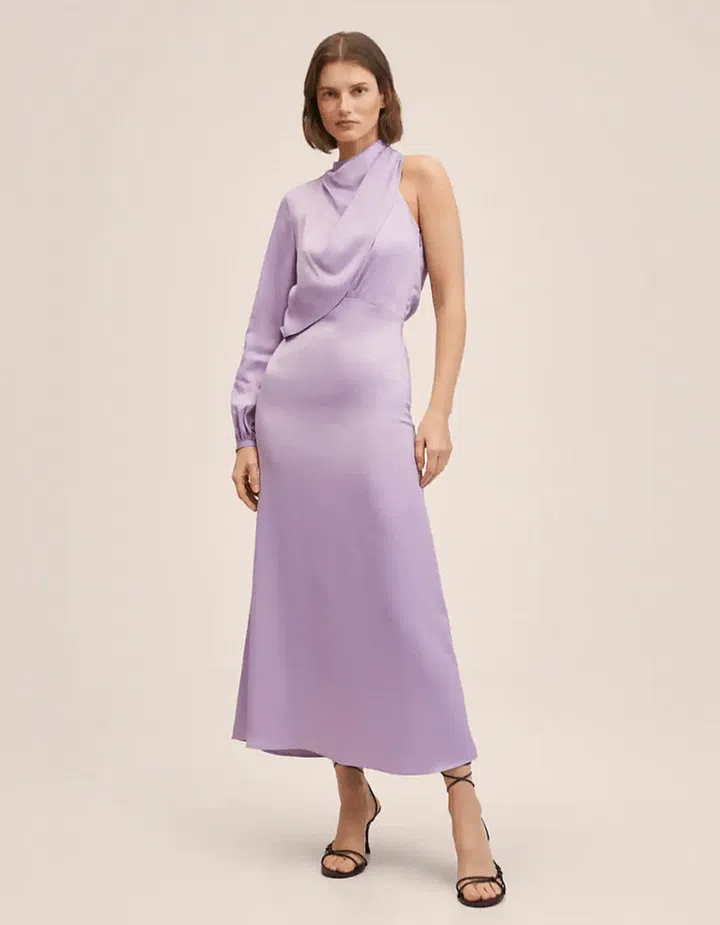 Make a soft statement in this lilac dress with an asymmetric sleeve! With a comfortable A-line cut to the skirt and soft drapes around the neckline, it’s also a great dress to wear for a daytime party.