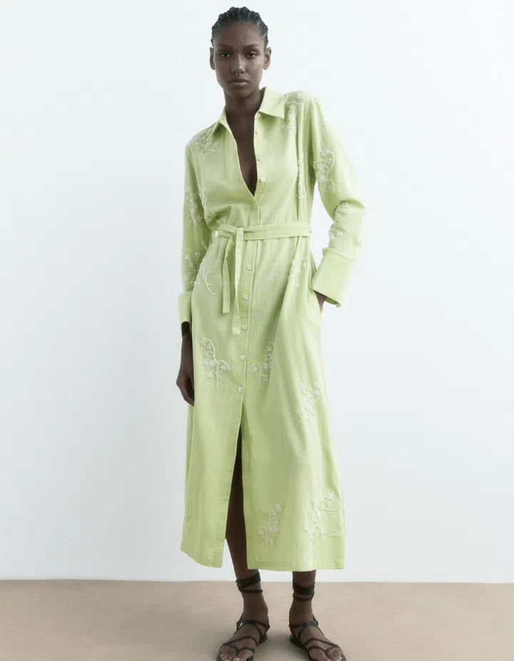 The classic shirtdress silhouette gets an elegant springtime update here with embroidered bluebell flowers in white set against a fresh grass green tone. After your bridesmaid’s duties are done, wear it with flats for the office!