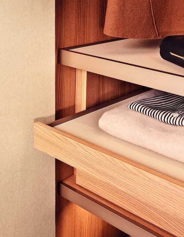 The quickest way to elevate the dressing experience and show off your designer collection is by installing lights in your wardrobe. But be sure to use LED bulbs that give off less heat and instal them in areas where your clothes cannot come into contact with them. Heat can damage clothing fibres and embellishments. If you have the luxury of a walk-in wardrobe with a window, use the blinds to keep your clothes out of direct sunlight.