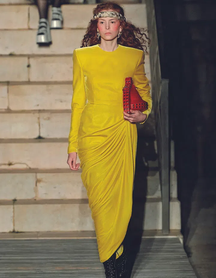 Lebanese fashion designer Zuhair Murad, a maestro of red carpet looks, was equally enamoured with this detail, applying it to an array of slinky column gowns in bejewelled tones of purple, pink and yellow.