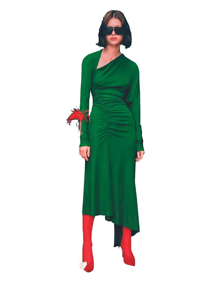 When even fashion designer Victoria Beckham – known for her minimalist aesthetic – references the unapologetically bold excess of the ’80s, you know the era is making a comeback. In her Resort 2023 collection, tights in yellow, red and pink were styled with everything from skirt suits to slinky dresses. Another striking look: a ruched green asymmetrical dress, which she playfully styled with bright red stockings.