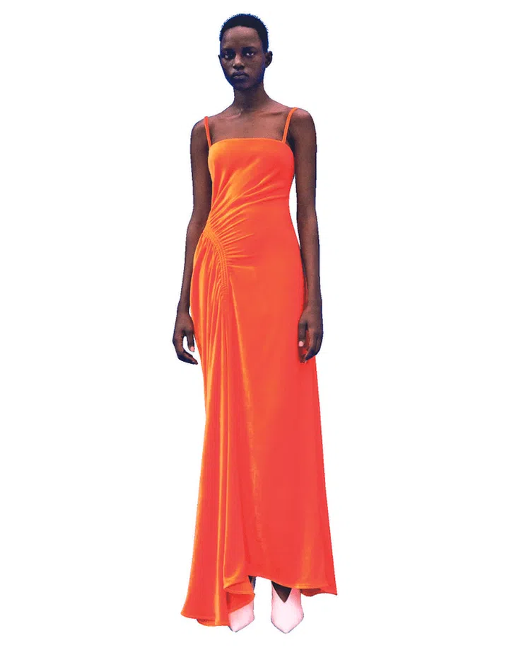 This redeeming quality of the ruched dress was not lost on designers Lazaro Hernandez and Jack McCollough of Proenza Schouler. They showcased a fun and elegant tangerine dress with side gathers, rendered in a luscious velvet material.
