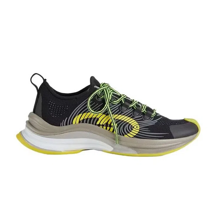 Gym shoes, but make it bougie. Technical knit is cut slim-fitted and streamline for a sleeker silhouette, with Gucci’s double-G logo abstracted into neon yellow shapes on the side.
