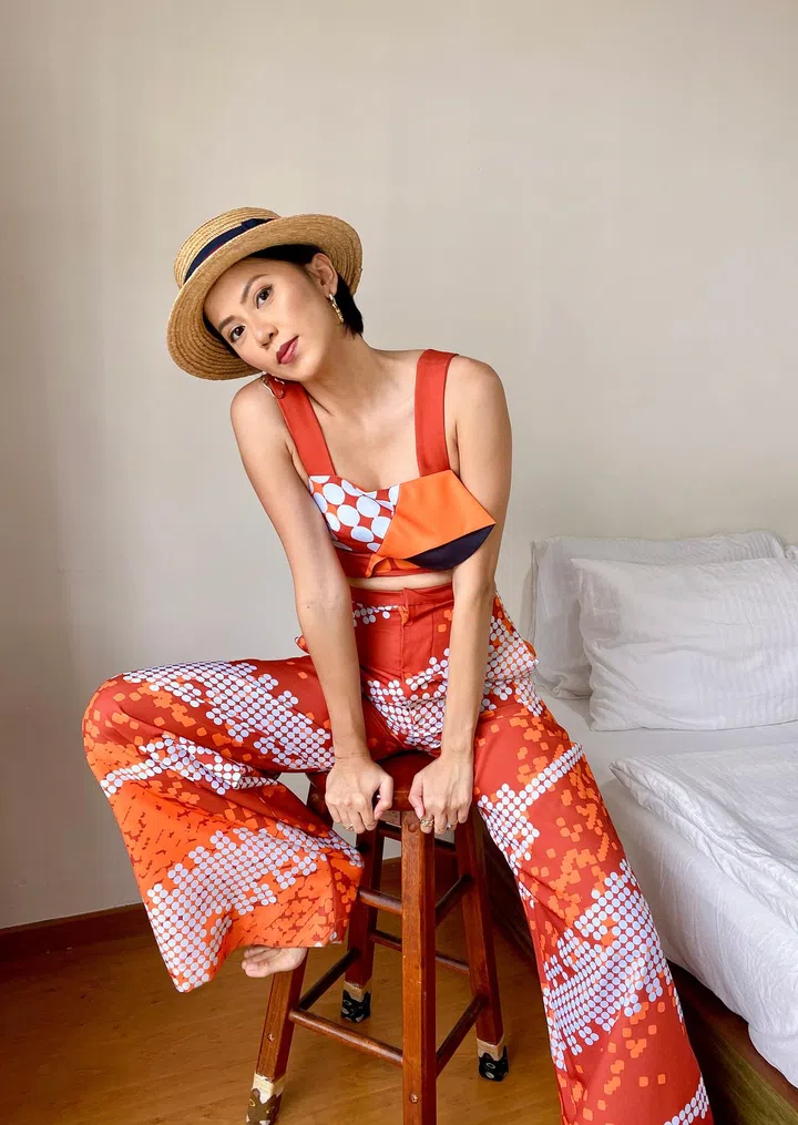 “I love a good set of co-ords. My friend Cheryl Teo designed this geometric-print set for her final-year project at Lasalle College of the Arts and she sewed one for me as I couldn’t stop raving about it. She eventually started her own line called Aryl Ctto for a while. The best part is I can wear either the top or the pants on separate occasions.”