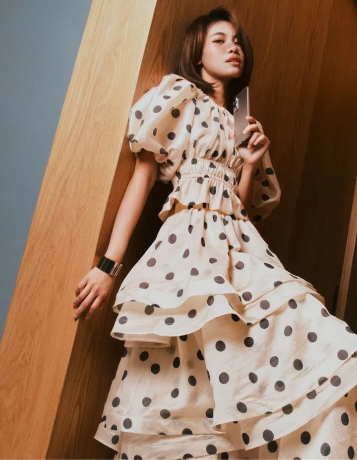 “By the way, I used to trim my hair whenever I dyed it. For this cut, I hoped my managers wouldn’t notice. But when they did, I was like, oh no! They did!” She tosses her head back and laughs, her energy bright and a little unpredictable. Engineered, almost, to keep you leaning forward.