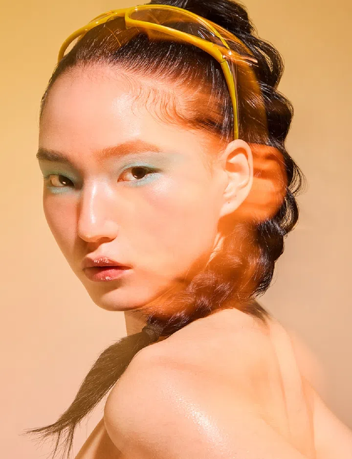 Maximum impact, minimal effort. Dress up your eyelids with a whisper of pearlescent blue shadow. A subtle nude pout and glossy skin complements the peepers.