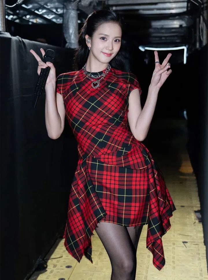 The fit: Jisoo wears a head-to-toe McQueen look from its Spring Summer 2026 pre-collection: a wool tartan mini dress and Sofa Chelsea boots in black leather.