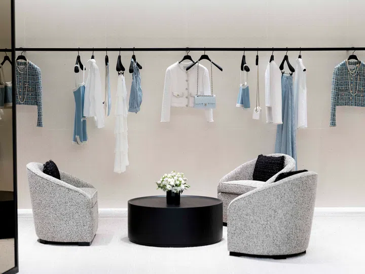 Inside, plush lounges double as private salons, with mirrored sliding doors creating a discreet setting for a personalised shopping experience. Plush lounges that can also be turned into private rooms, featuring mirrored sliding doors that create an intimate setting for personalised shopping. In the footwear area, guests can relax on a beige suede sofa inspired by Gabrielle Chanel’s own, while browsing standout styles from the latest collection.
