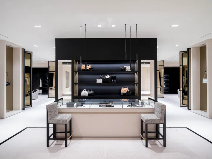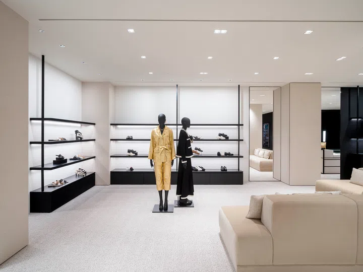The boutique blends timeless elegance with modern sophistication. The House’s signature palette - black, white, and beige - is accented with gold, while curated furnishings and bespoke details blends timeless elegance with modern sophistication.