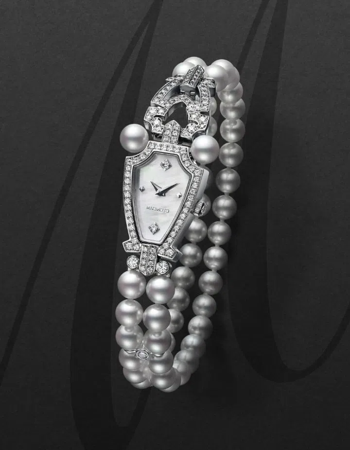 Mikimoto bracelet watch in white gold with Akoya cultured pearls, mother of-pearl and diamonds