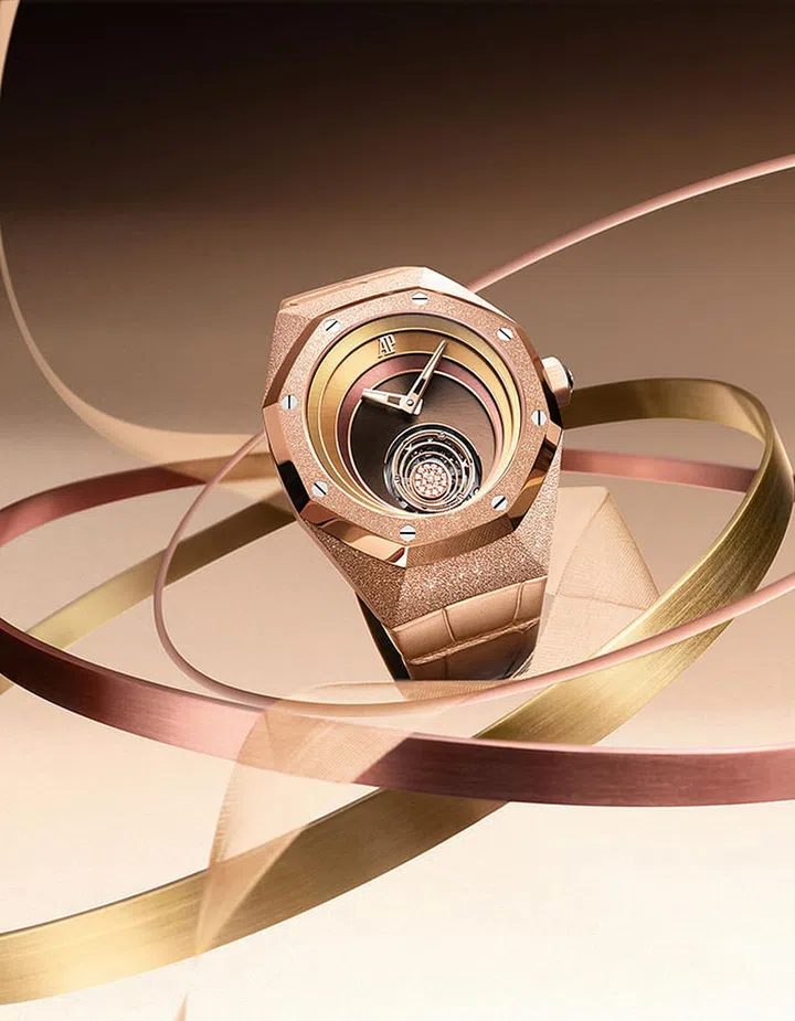 First launched in 2002 to celebrate the Royal Oak’s 30th anniversary, the Royal Oak Concept is now a full collection where the brand’s most cutting-edge ideas go to blossom. With Ralph’s guidance, this 102-piece reference is awash with brown, bronze, and gold tones, with a “Frosted Gold” case (a texture achieved by diamond-tipped tools hammering tiny indentations in the surface) creating contrast with the satin-brushed radial pattern on the dial. The concentric rings converge on a diamond-set flying tourbillon, furthering the illusion of depth.