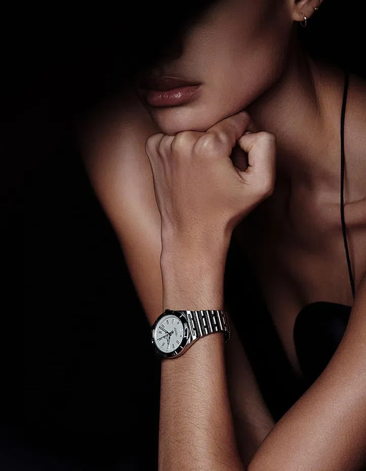 Despite its origins as a tool watch for pilots, the Chronomat has evolved to become Breitling’s all-occasion timepiece, characterised by its raised rider tabs at the cardinal points and distinctive rouleaux bracelet. With Beckham’s help, the feminine Chronomat 36 gets the runway treatment with gold or steel models dressed in dial colours taken from her Spring/Summer palette.